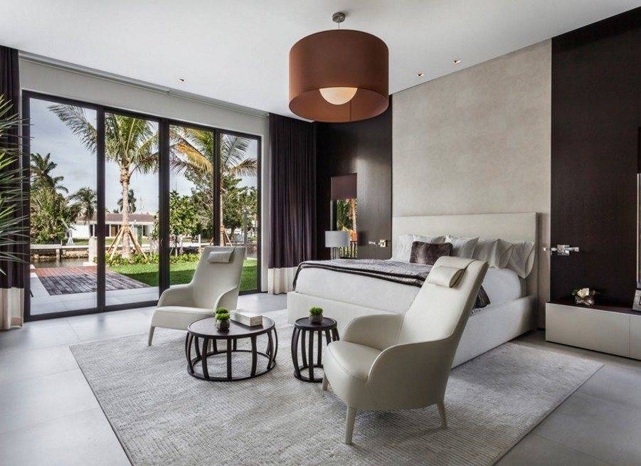 Лучше, если люстры в интерьерах спален, выполненных в минималистических стилях, будут давать децентрированное освещение