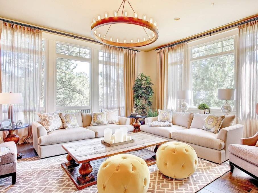 Повесьте красивую люстру в гостиную, которая сочетается с обстановкой, подходит по ширине и высоте, стилю помещения, и комната сразу преобразится.