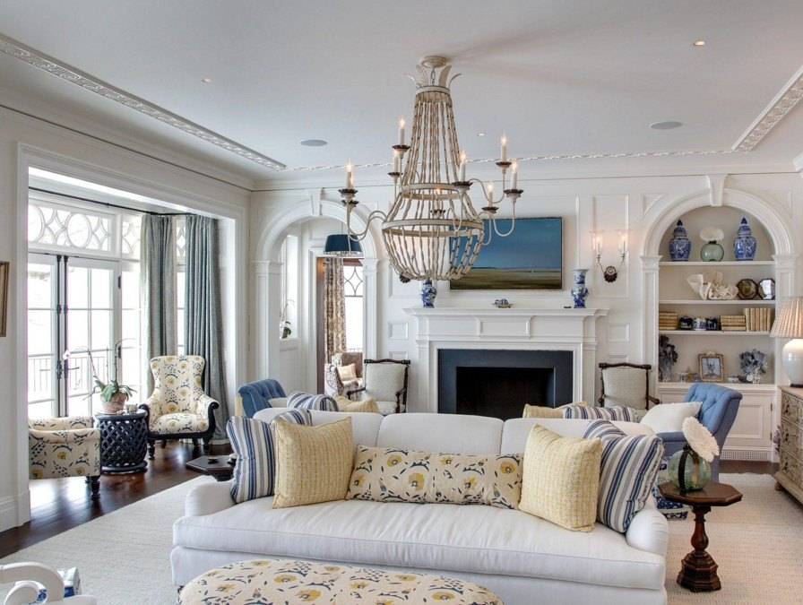 Люстра в интерьере гостиной – вот тот предмет, который играет главную роль в украшении зала. Впрочем, хорошее освещение – это незаменимый элемент в любом помещении в доме.