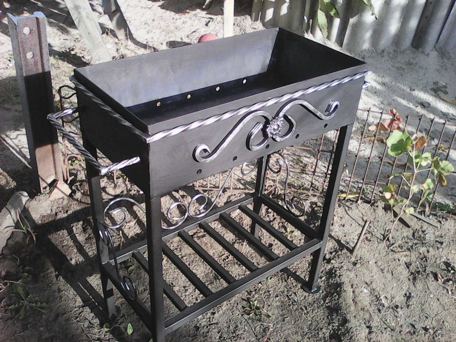 Начиная рассматривать устройство снизу вверх, обязательно нужно обратить внимание на ножки. Как правило, это четыре металлических уголка, заостренных книзу, чтобы их можно было воткнуть в землю. Высота этого элемента подбирается индивидуально, если изделие изготавливается на заказ