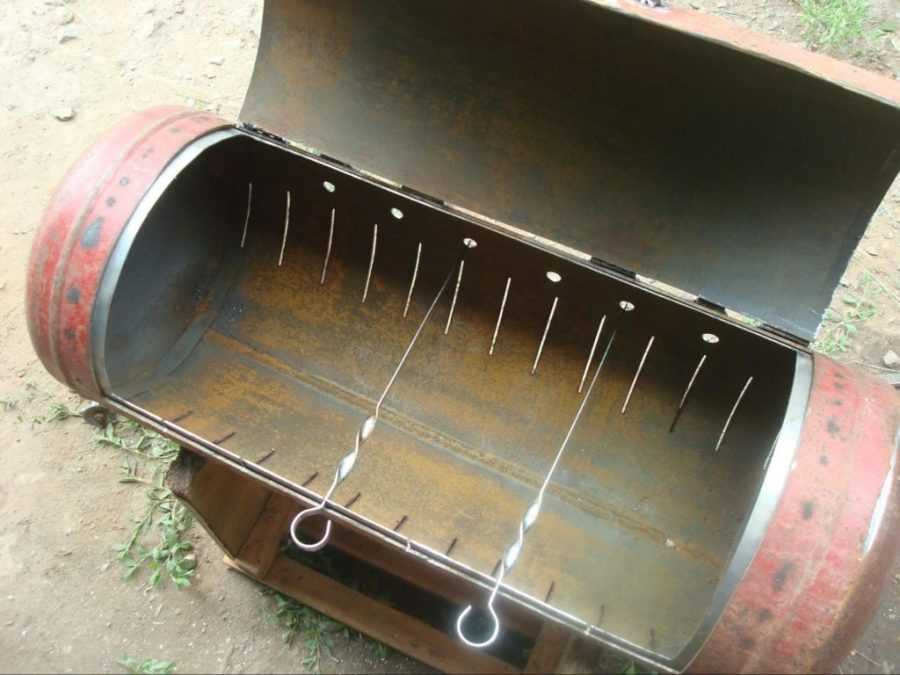 Шампуры укладываются в пропилы, изготовленные УШМ. По торцам бочки ниже жаровни просверливаются отверстия для обеспечения тяги. Эксплуатация с закрытым люком возможна и без трубы – для этого достаточно добавить отверстия в верхней части (шахматный порядок, диаметр от 1 см).