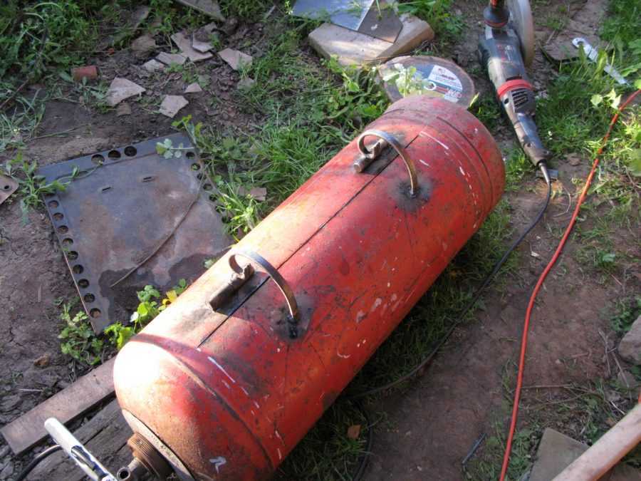 Мангал производится из бочки или газового баллона. Кроме емкости, потребуется болгарка, дрель, уголки из металла и аппарат для сварки. Сначала делается разметка и вырезается верхняя область бочки. Торцевые участки остаются на месте. Из верхней части делается крышка. Ножки производятся из уголков. Они привариваются к торцам бочки.