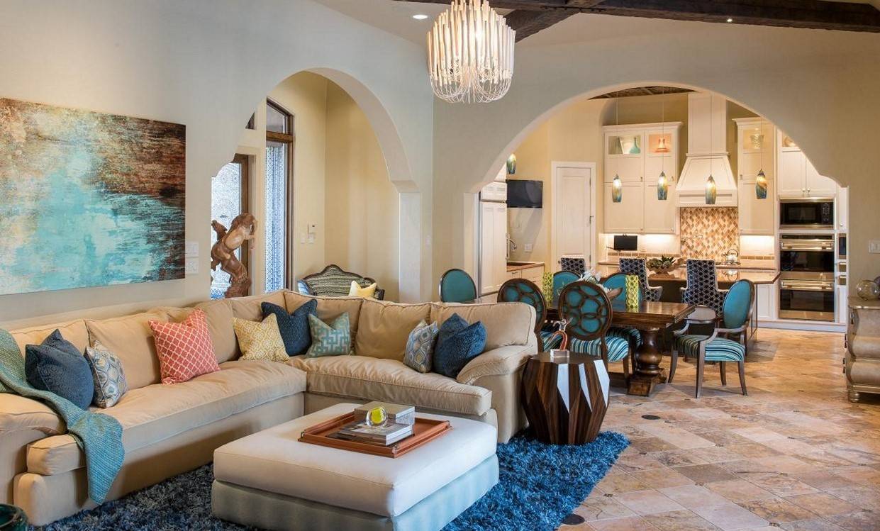 Цветовое исполнение марокканского интерьера не знает границ. Здесь можно смело сочетать теплые оттенки с холодными тонами, чередовать вычурные узоры с прямыми строгими линиями, применять различные материалы — стекло, дерево, кожу, керамику.