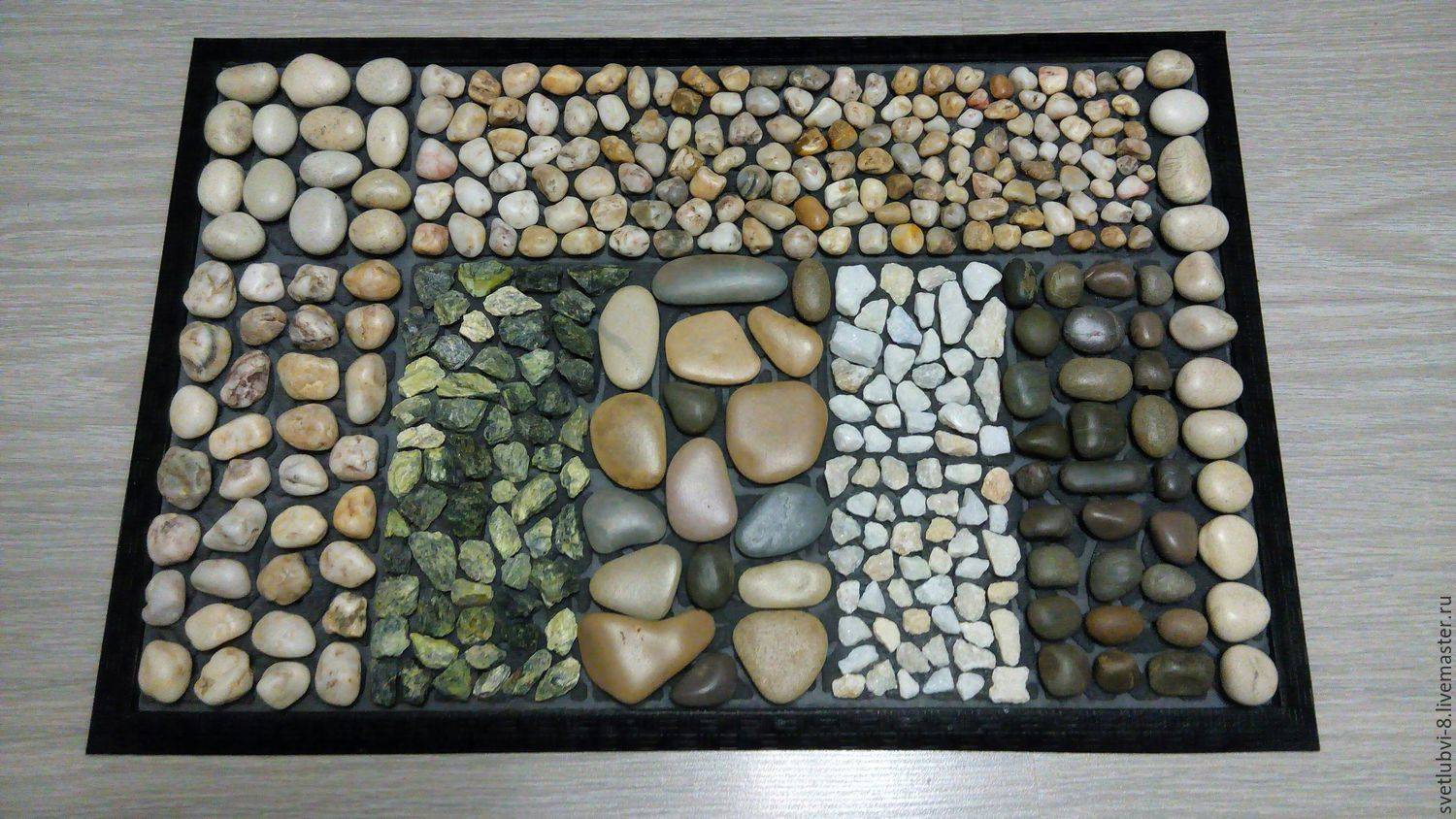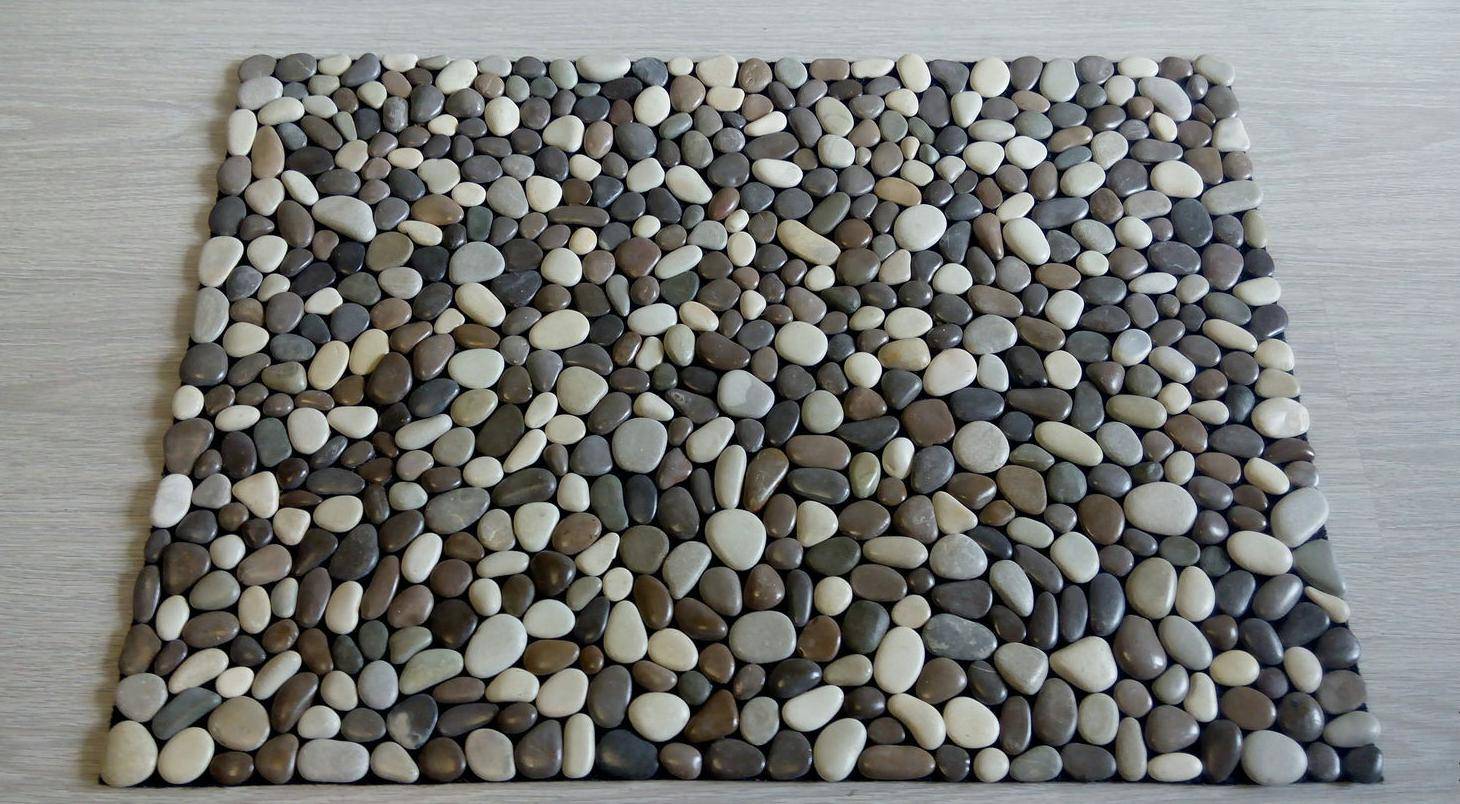 Один из самых эффективных ковриков получается из мелких и крупных камушков. Прогулки по подобному изделию позволят усилить кровообращение, вследствие давления на нервные окончания стопы. Преимущества данного материала: