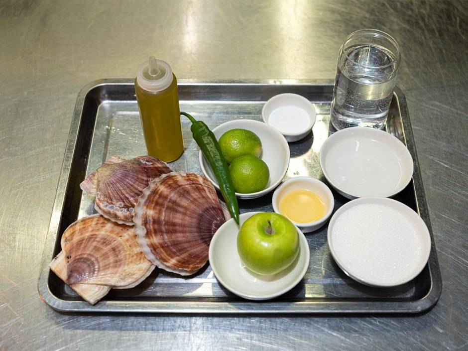 Крудо из гребешка с юдзу кошо и зеленым яблоком