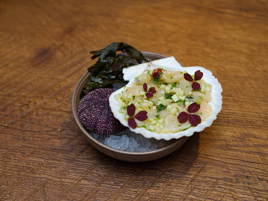 Почистите и нарежьте гребешок тонкими слайсами. Замешайте гребешок с юдзу кошо, оливковым маслом и маринованным яблоком, выложите обратно в раковину. Сверху добавьте рваные листья мяты и кислицу.