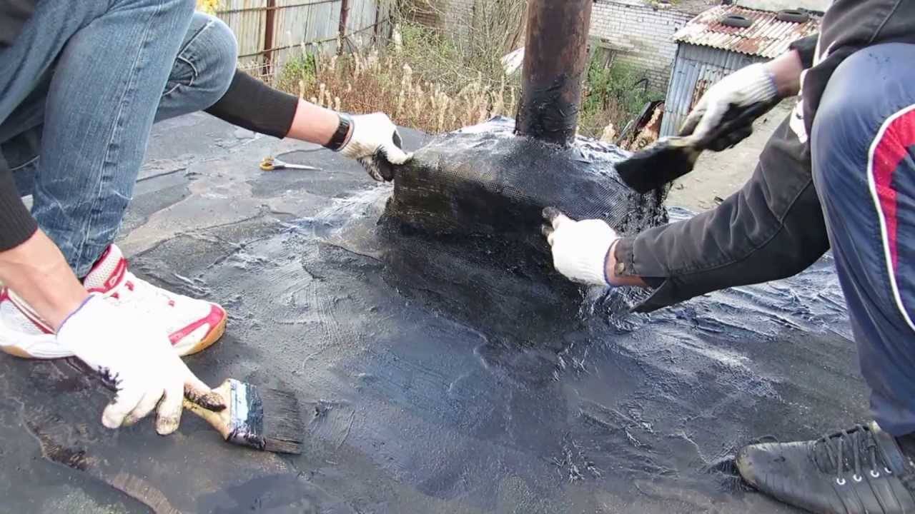 - На следующем этапе осуществляется нанесение резинобитумного состава при помощи валика, кисти или шпателя. Также часто применяется способ заливки. Но при совершении таких действий стоит следить, чтобы состав равномерно распределялся по кровле. Толщина слоя должна составлять не более 1,5 мм. Создание последующих слоев должно осуществляться только после того, как первый полностью высохнет.