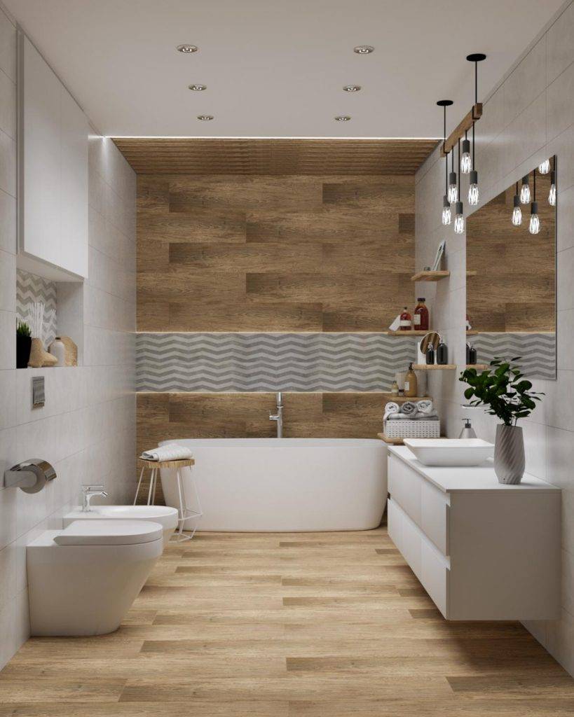 Предложение плитки для ванной комнаты под дерево в изобилии, как с точки зрения цветов, так и размеров. Дерево в сочетании с белой блестящей плиткой смотрится ультра-современно.