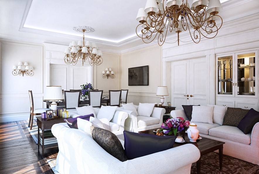 Интерьер гостиной в классическом стиле предполагает обилие света. Обязательно должна присутствовать большая массивная люстра с подвесками из хрусталя или декоративного стекла. Как правило, это изделия, корпус которых имеет плавные изогнутые линии. Классические люстры правильной круглой формы, тяжёлые, снабжены множеством мелких деталей.