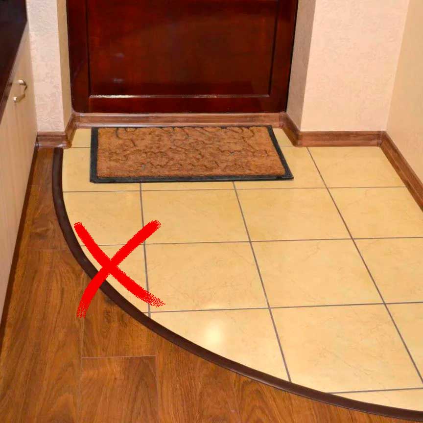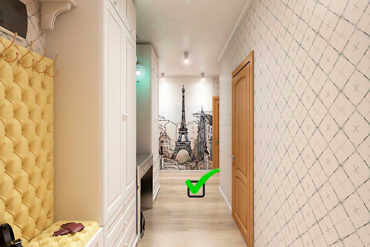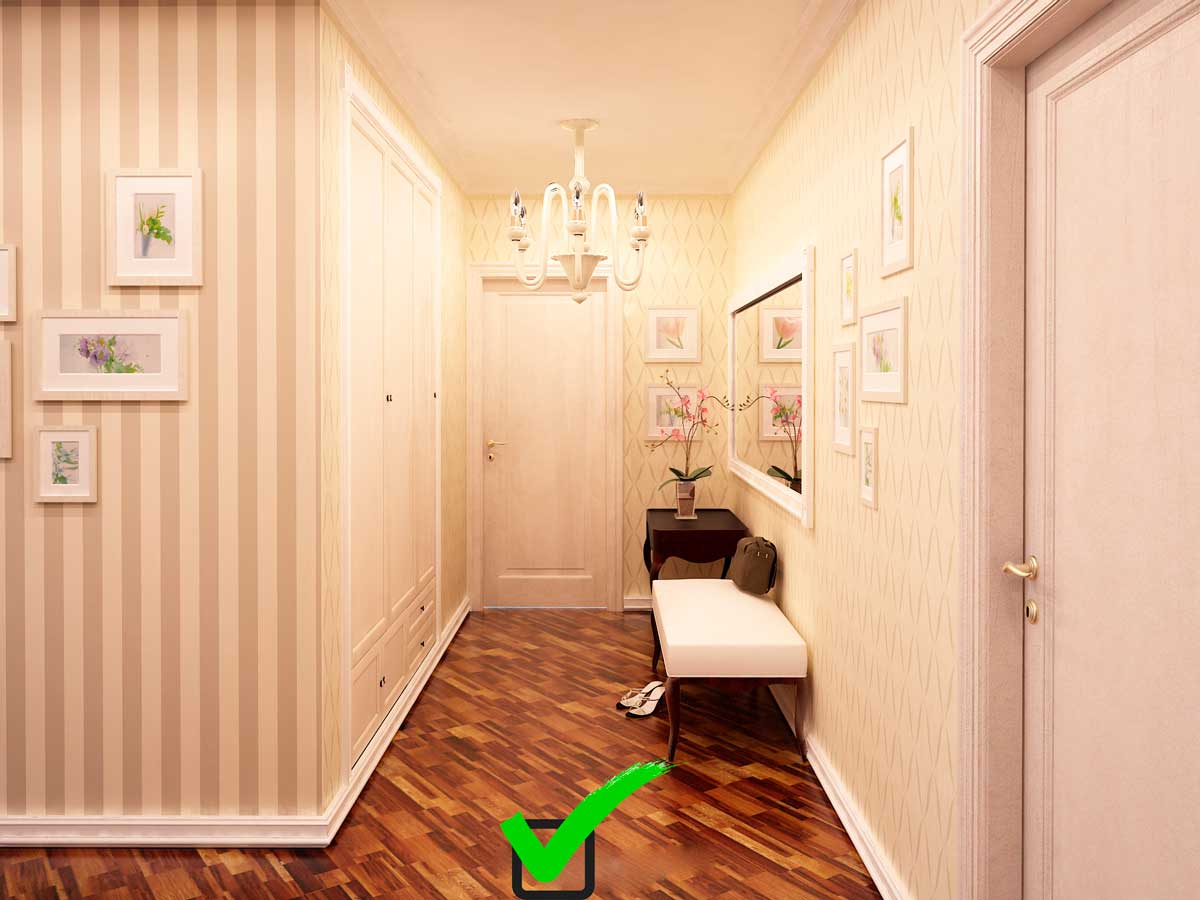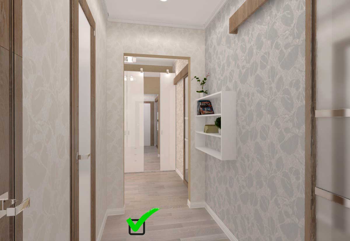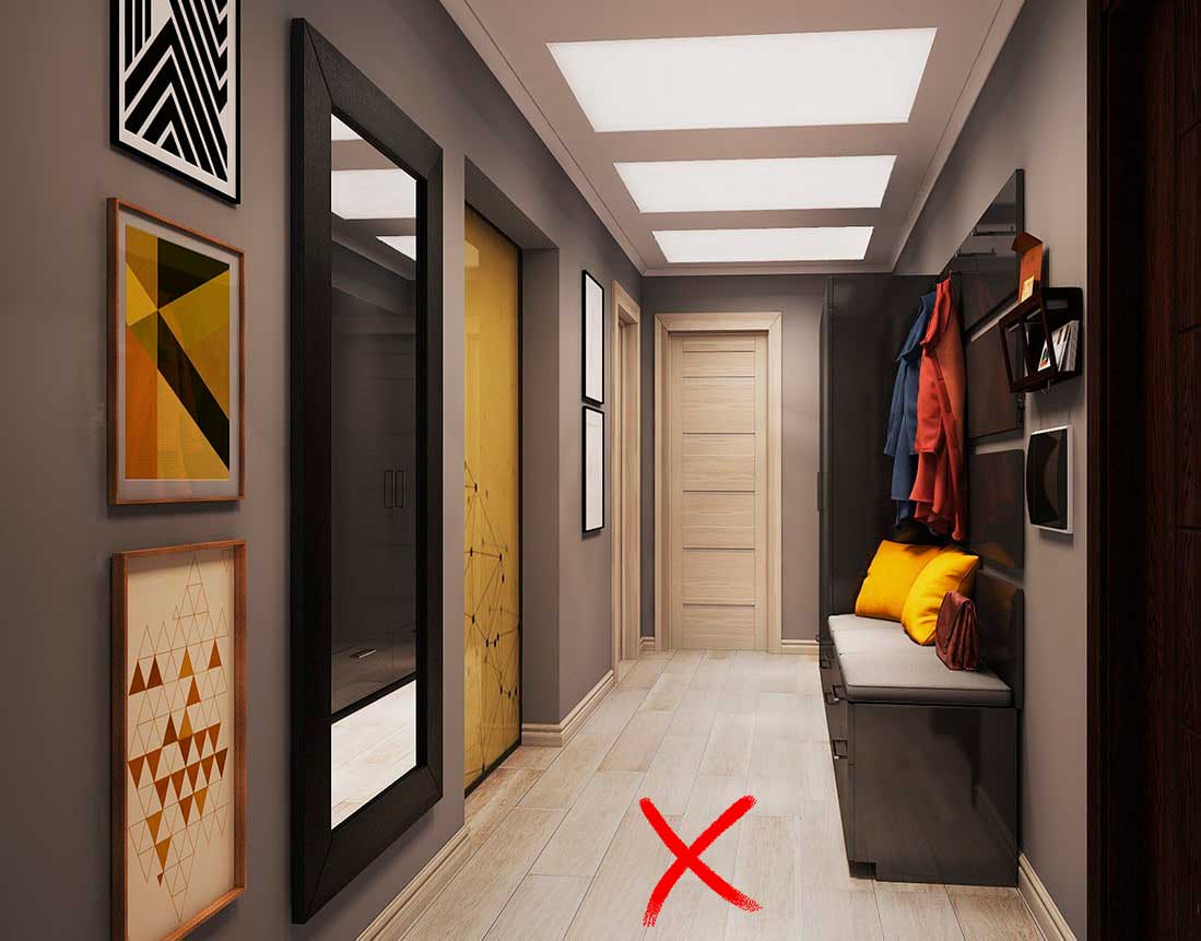 В узком коридоре не следует укладывать ламинатную доску и другие вытянутые в длину покрытия вдоль: это делает его зрительно ещё более узким. Лучше предпочесть укладку поперёк или по диагонали.