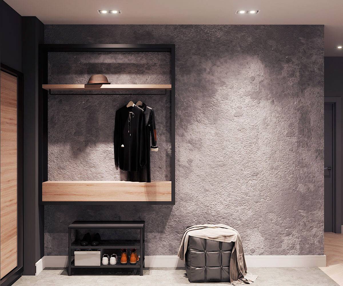 Отделочные материалы для оформления стен дизайнеры рекомендуют комбинировать для создания уникального дизайна в маленькой прихожей. После того, как поверхность стены будет выровнена и подготовлена к работе, ее можно окрасить акриловой или водоэмульсионной краской, оклеить фактурными обоями или использовать декоративную штукатурку, ПВХ-панели.