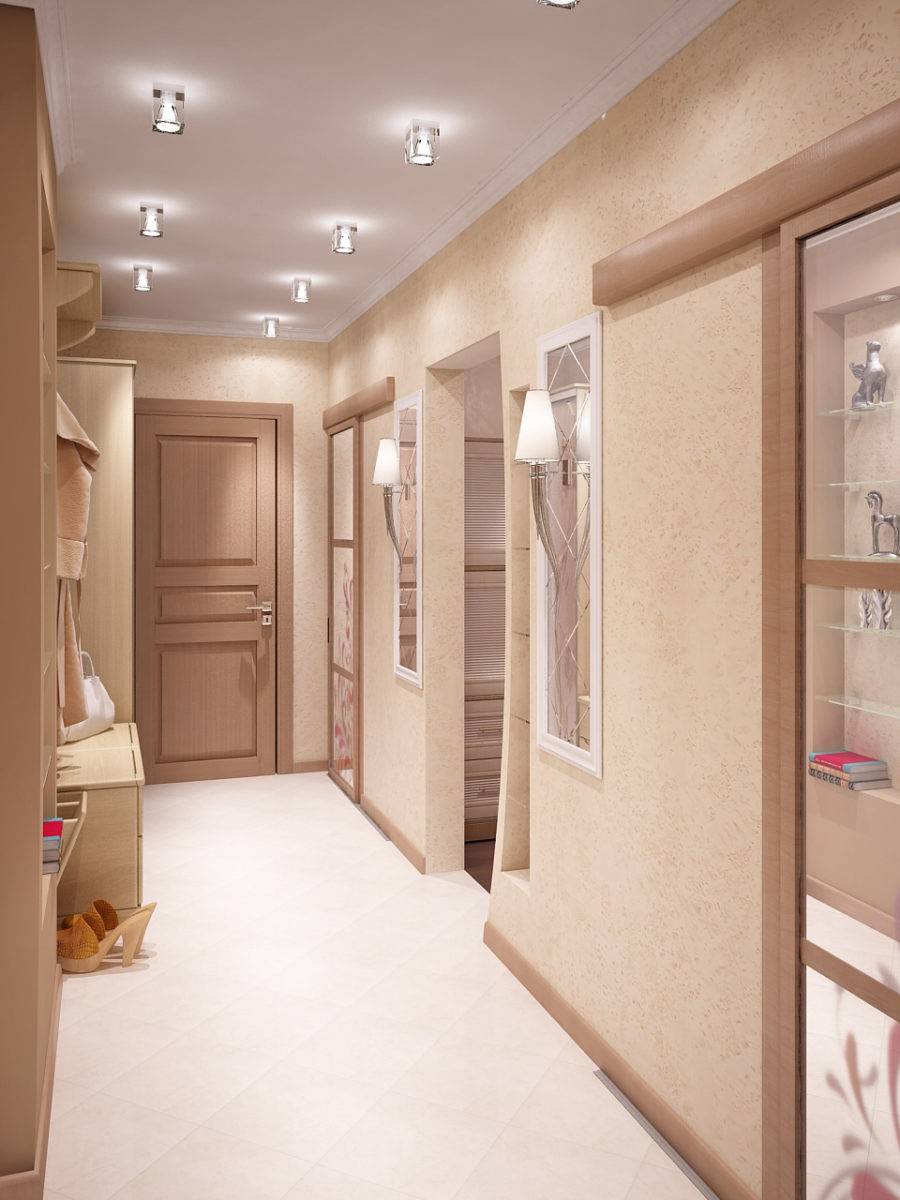 Если коридор оформлен в классическом стиле, в центре можно установить миниатюрную висячую люстру, а вдоль коридора — небольшие настенные бра. Последние лучше располагать ближе к потолку – тогда они гарантированно не будут мешаться.