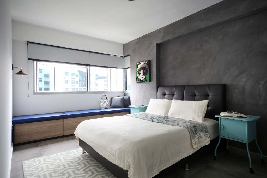 дуэт бежевых обоев и синего текстиля в спальной комнате
