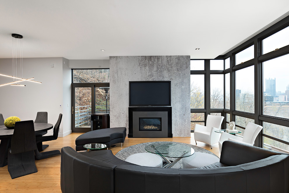 - Модерн – стены с бетонной фактурой станут удачным фоном для ярких предметов мебели и вычурных форм, подчеркивая их индивидуальный стиль без загромождения пространства. Глянцевые поверхности, стекло и металл, обилие цвета и всевозможных фактур прекрасно гармонируют с однотонными гладкими бетонными стенами.