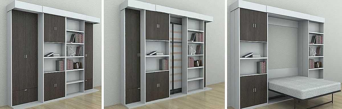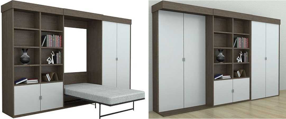Эта мебель имеет не меньшую функциональность, чем обычная стенка. Разве что под нее требуется больше места по «глубине» — чтобы можно было отодвинуть часть шкафа. Но все полки при этом функциональны, что в трансформируемой мебели редкость. Пусть даже они меньшей глубины, чем могли бы быть при этом в обычном шкафу, зато кровати в дневное время не видно. Вид — деловой или официальный, помещение может быть гостиной или столовой. А вечером, при опущенной кровати, превращается в спальню с полноценной кроватью.