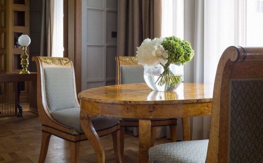 Минимальное количество мебели. Классика не предполагает использование громоздких стен, стеллажей, шкафов.