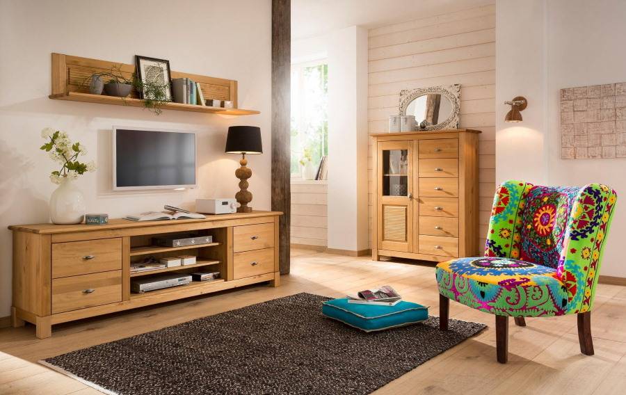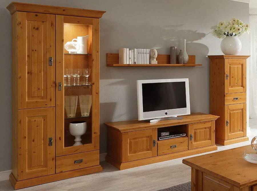 Гостиные из массива сосны отличаются прочностью и одновременно мягкостью. Янтарное сияние древесины вносит в интерьер помещения частичку солнечной энергии, жизнерадостность и легкость. Сосна считается одной из самых дешевых пород. Из нее изготовляют дачный гарнитур, аксессуары, лестницы, двери.