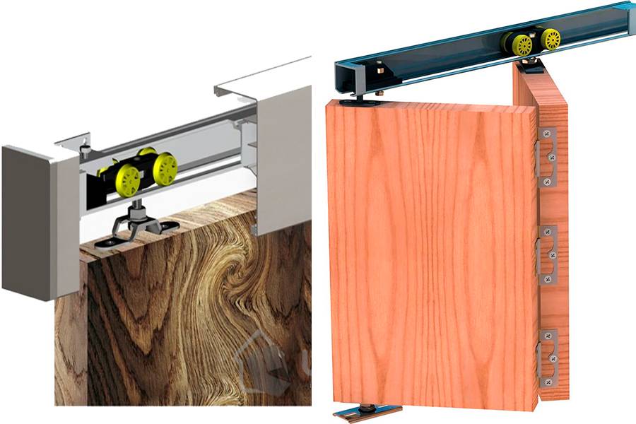 Накладной. В данном случае направляющие и ролики устанавливаются на стену, снаружи от дверного проема. Этот вариант более простой в установке, однако помните, что полотна дверей в таком случае всегда будут находиться на виду.