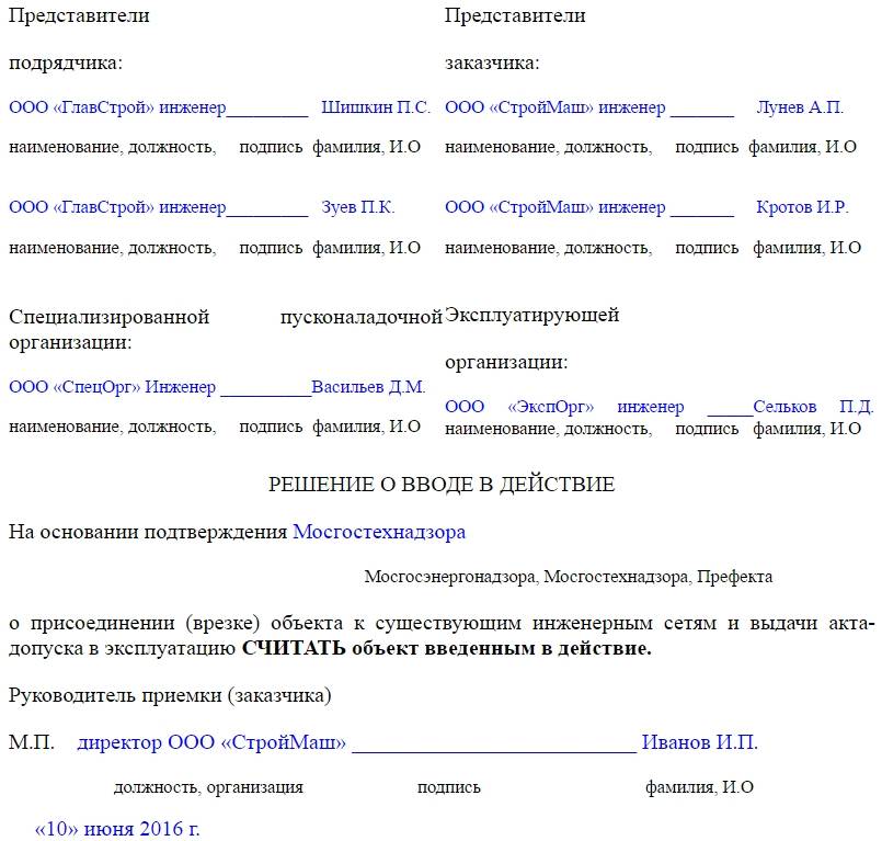 После внесения основный сведений о приемке объекта и фиксации факта ввода его в эксплуатацию, акт должен быть подписан всеми членами комиссии, присутствовавшими при осмотре объекта и делавшими вывод о его пригодности к использованию. Их подписи должны быть проставлены напротив указания должностей и названий организаций, которые они представляют.