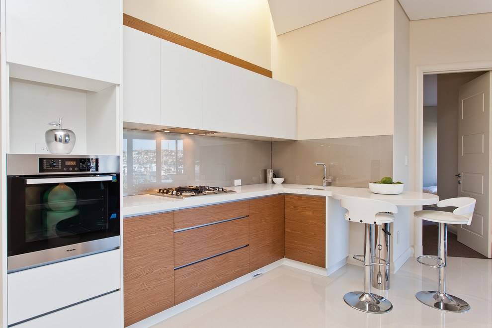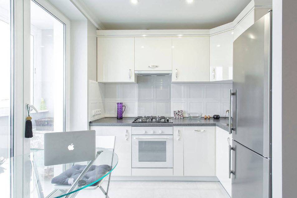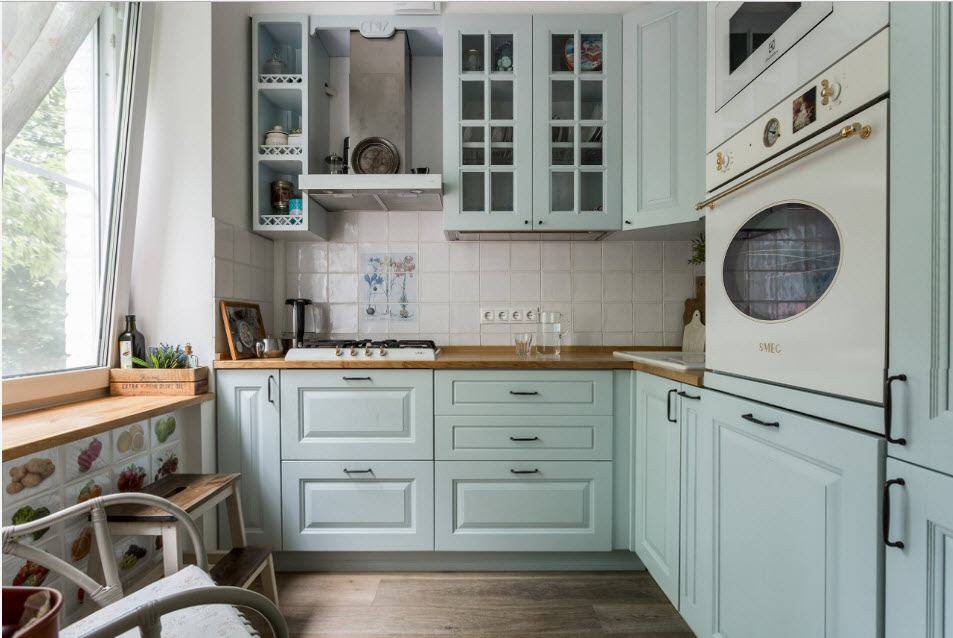 Вариант углового размещения гарнитура не менее практичен в маленьких кухнях. В данном случае мебель устанавливают под прямым углом у стен. Такая кухня позволяет разместить достаточно шкафчиков, а напротив гарнитура поставить обеденный стол.