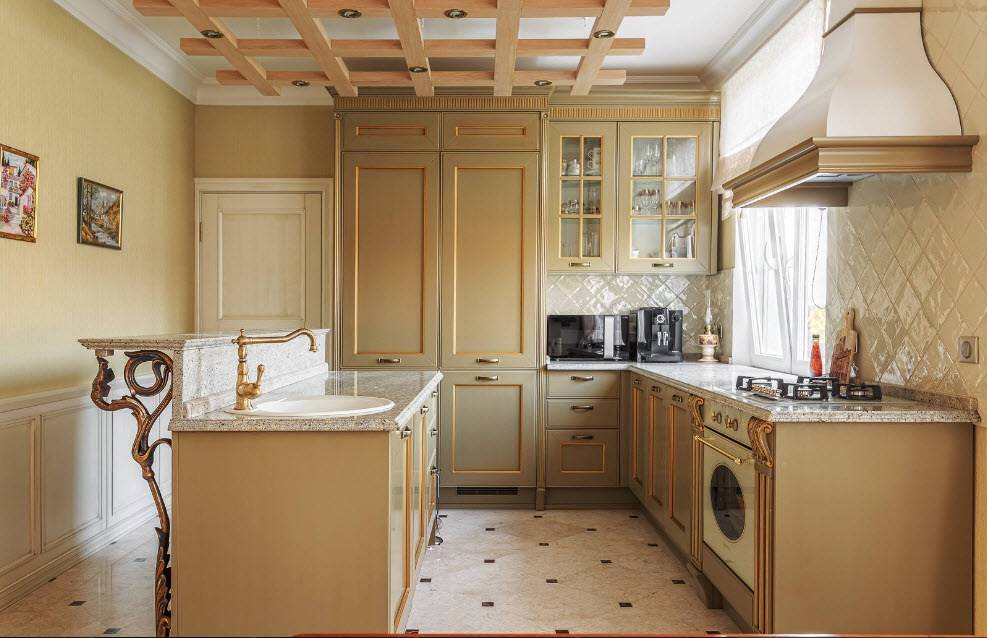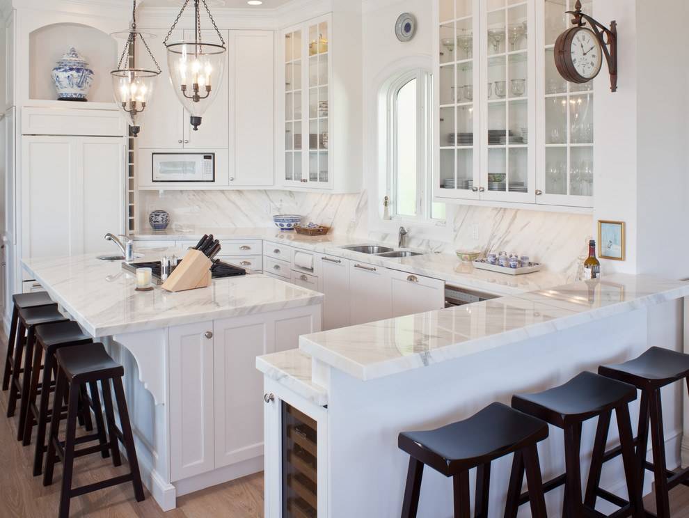 Кухонный гарнитур в П-образной планировке не обязательно должен быть цельным, вполне допускаются отдельно стоящие секции и модули. Основная задача – сделать кухню удобной.