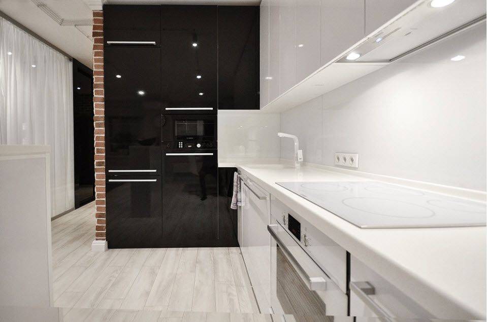 если имеется ниша, ее можно занять гарнитуром. Конечно, большую кухню здесь не разместить, зато мойку, плитку или кухонный стол (в зависимости от размеров ниши) вполне возможно;