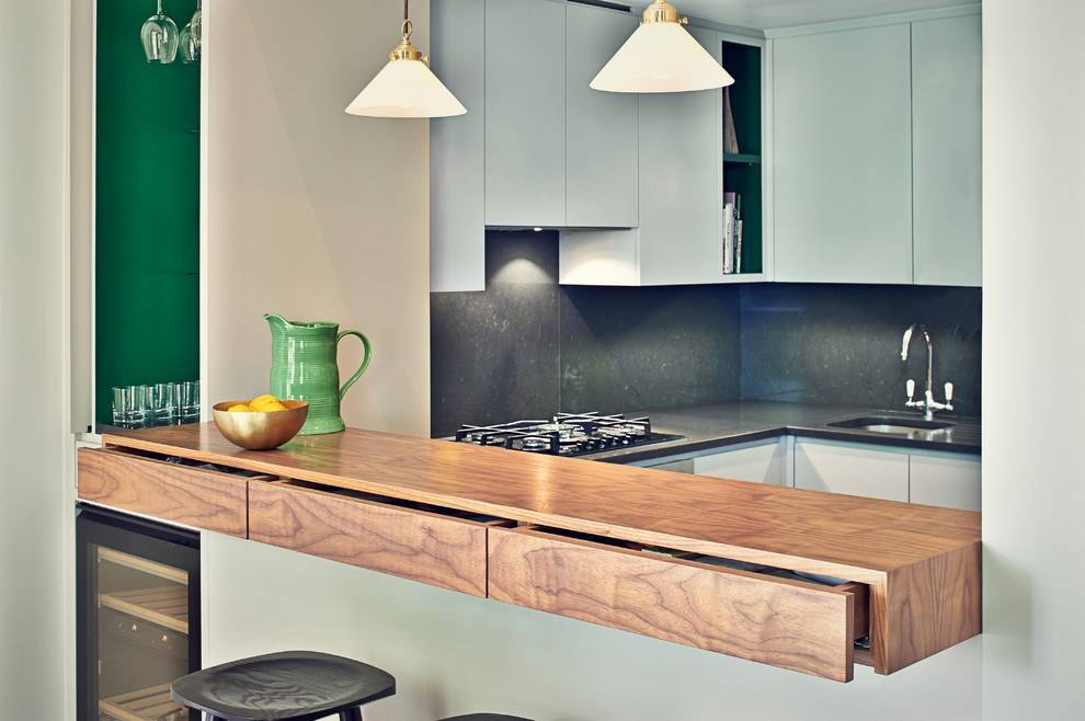 прекрасной альтернативой обычному столу может стать барная стойка, которая будет еще и декоративным элементом на кухне;