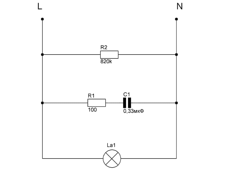 Если на пути следования заряженный частиц между диодным мостом и конденсатором установить сопротивление – резистант, то ток дойдет до конденсатора в ослабленном значении, которое не позволит лампе мерцать в выключенном положении.