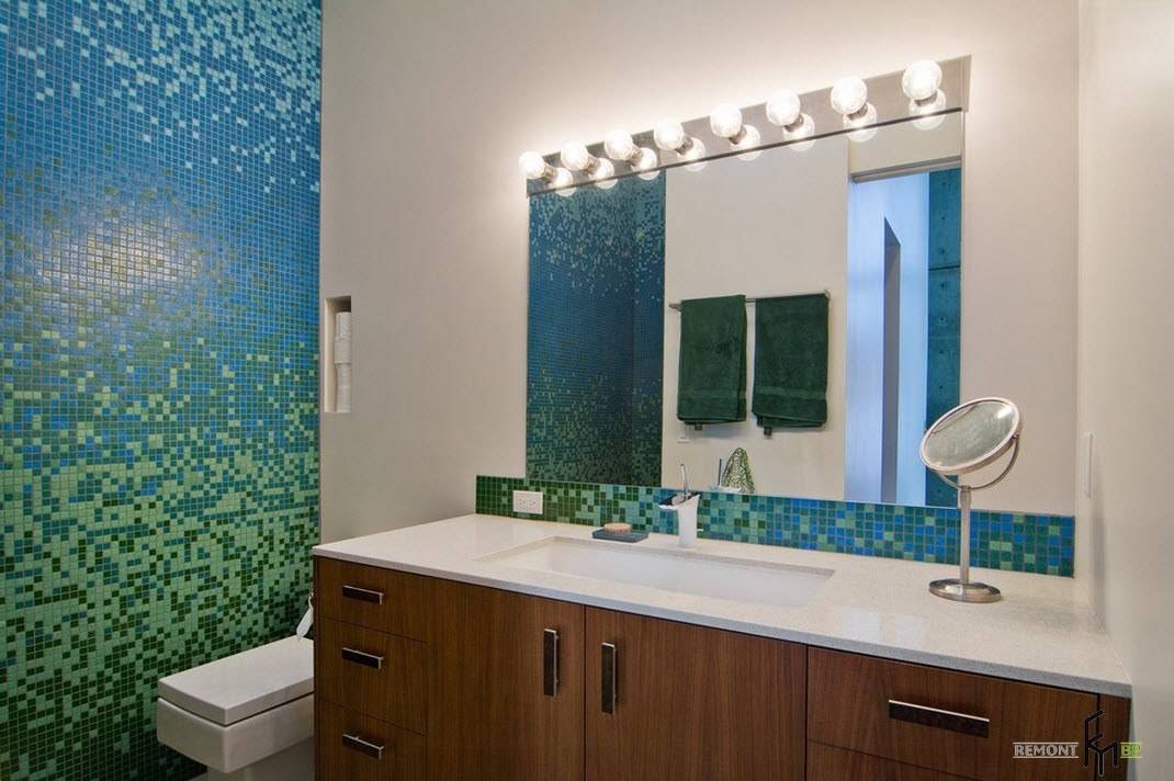 Создать эффект роскоши, блеска можно разбавив мозаику зеркальными вставками. Если при этом в ванной будет правильное освещение, то все будет сверкать.