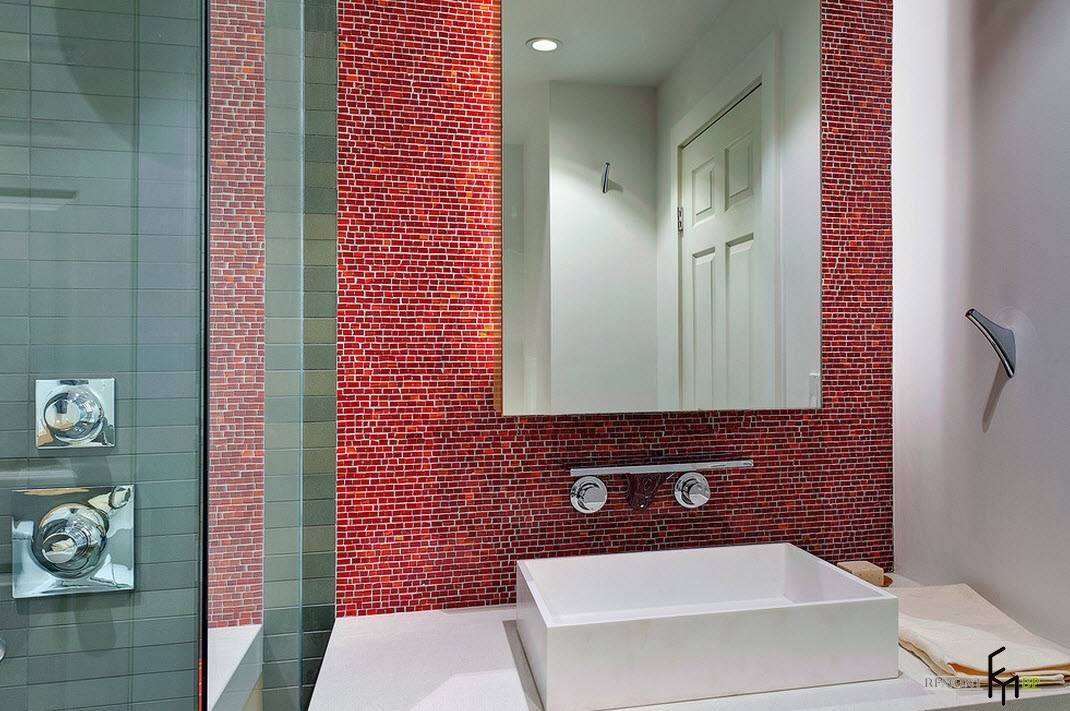 Для визуального расширения комнаты с ванной в отделке одной стены применяются плиты с глянцевыми поверхностями, зеркальная мозаика, крупные зеркала. Возможно оформление плоскости художественной мозаичной плиткой из стекла либо смальты.