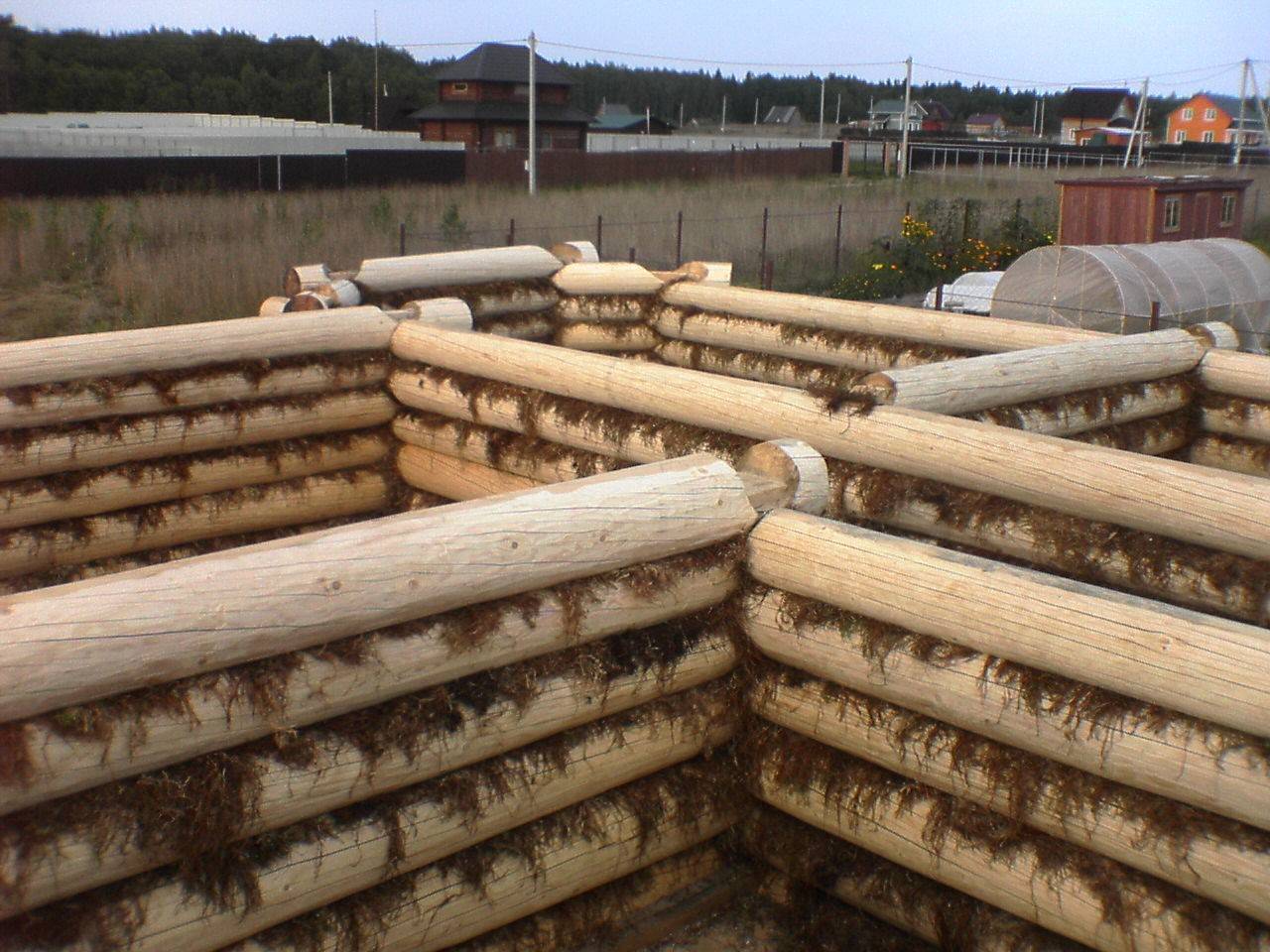 Уложенные бревна сруба и межвенцовый утеплитель между ними