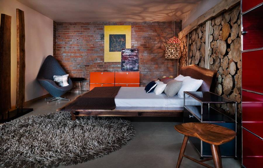 Стиль лофт лучше использовать в оформлении спальни для молодого человека с активной жизненной позицией. Главный принцип этого стиля – индивидуальность и много свободного пространства. В таком интерьере гармонично сочетаются современная техника и необработанные бетонные поверхности, кирпичная кладка, открытые коммуникации, такие как электрические провода, водопроводные и вентиляционные трубы.