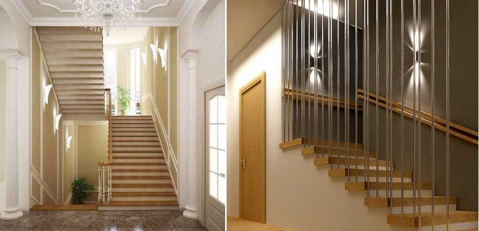 Лестницы на второй этаж почти всегда оснащены настенными осветительными приборами. Их нужно несколько для хорошей освещенности. Однако главное — не переусердствовать: светильники не должны создавать препятствий при движении. Лампочки следует располагать на уровне немного выше головы. Если такая возможность отсутствует — не ниже уровня плеч.