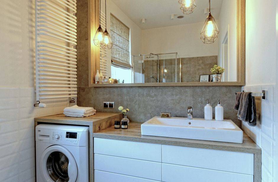 Лучше оставить свободное пространство, приобретя душевую кабину или сидячую ванну вместо большой ванны с гидромассажем. Сэкономить место позволит монтаж компактного душевого уголка. Стиральную машинуможно разместить под умывальником.