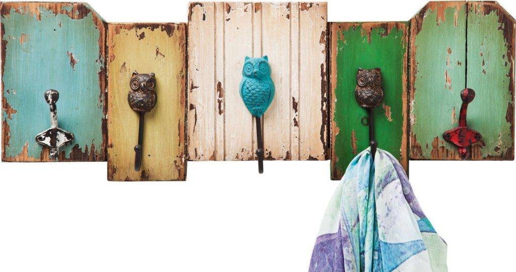 Готовую вешалку можно дополнительно облагородить. Это может быть глизаль, художественная роспись, кракелюр или декупаж. Перед покрытием нужно очистить поверхность вешалки.Затем ее грунтуют, валиком или малярной кистью с целью заполнить все микротрещины и другие изъяны материала.