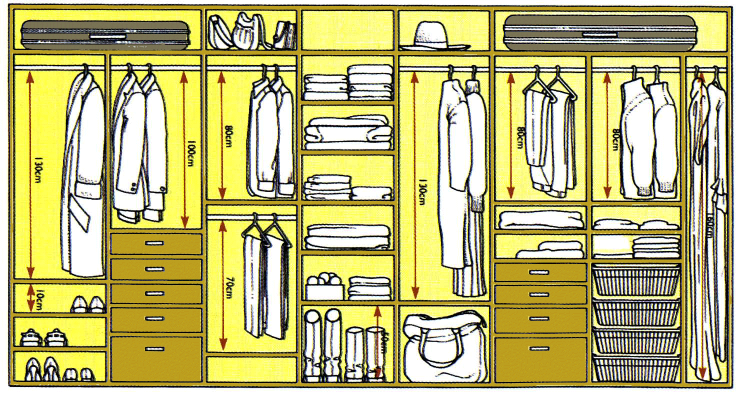 - Для хранения короткой одежды на плечиках проем должен быть 80-100 см, а для длинных пальто – 150-160 см. Чтобы рассчитать проем для штанги более точно, прибавьте к самой длинной одежде 20 сантиметров.