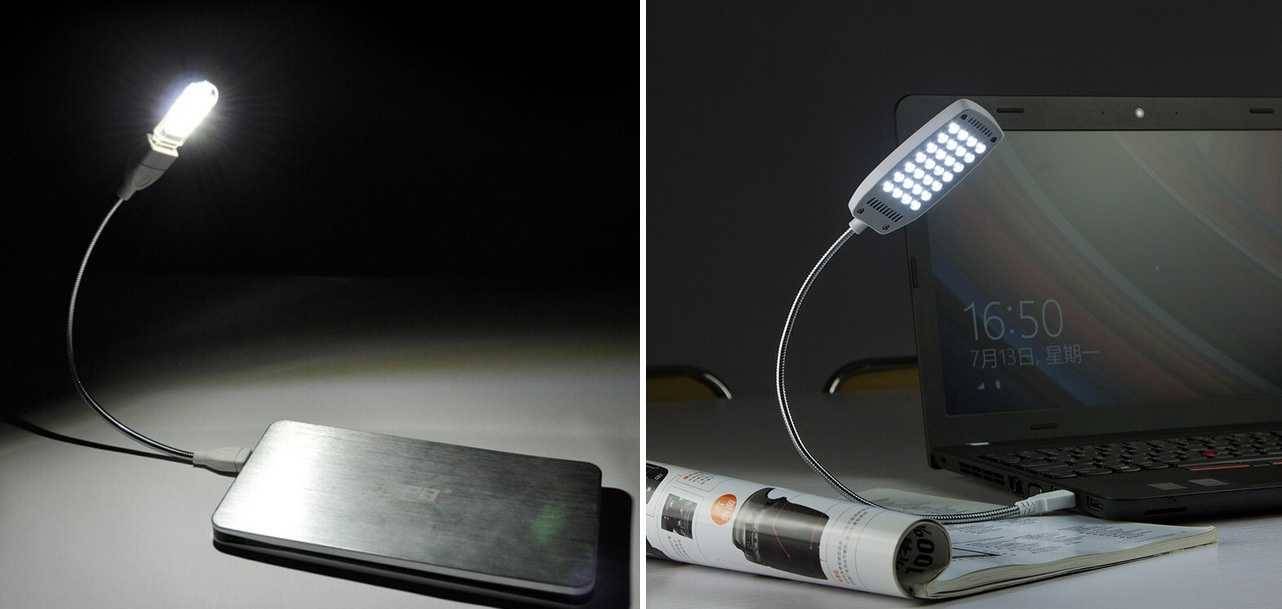 Кроме небольших USB-ламп для подсветки клавиатуры, есть достаточно большие настольные лампы. Они подключаются к тому же порту компьютера или ноутбука. К ним идет обычно шнур длиной в несколько метров. Он обеспечивает достаточную мобильность. Способы крепления — все описанные выше, вот только источник света — исключительно светодиоды. Ведь только LED технология при малом потреблении тока и низком питающем напряжении выдает яркое свечение. Такая настольная лампа для рабочего стола дает достаточно света, не занимает много места. Но питаться может только от пониженного напряжения.