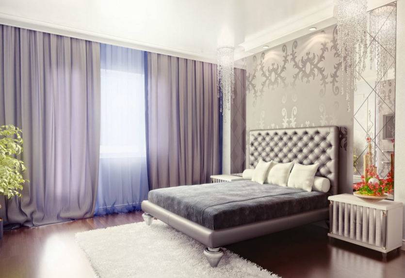 Глянцевые или лаковые – такие полотна обладают эффектом зеркального отражения, что способствует визуальному расширению спального пространства.