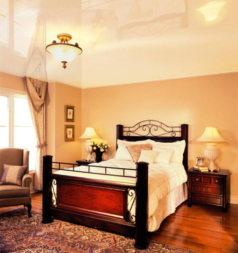 Глянцевый натяжной потолок для спальни