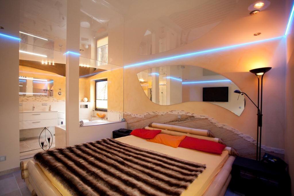 Натяжные потолки в любой спальне будут смотреться еще краше, если вы постараетесь грамотно обыграть особенности их фактуры при помощи разных источников света. Это могут быть: