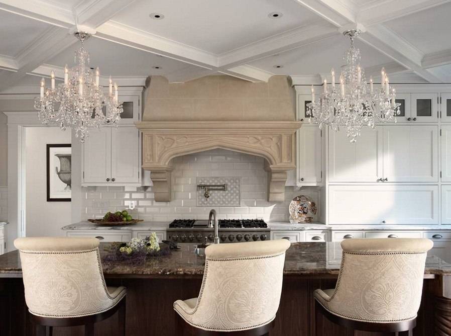 Люстру размещают ровно по центру потолка, но на просторной кухне она может быть смещена. Это зависит от выбранной для освещения зоны и дизайна потолка. Чем просторнее помещение, тем большее количество ламп понадобится для люстры. Для освещения прямоугольной комнаты или участка потолка подойдет вытянутая люстра, а круглый или полукруглый ярус украсит похожий по форме светильник.