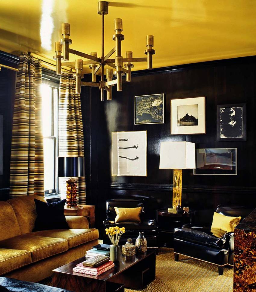 Гостиная с черными стенами и натяжным потолком станет оригинальным решением для тех людей, которые привыкли удивлять своих гостей неожиданными воплощениями