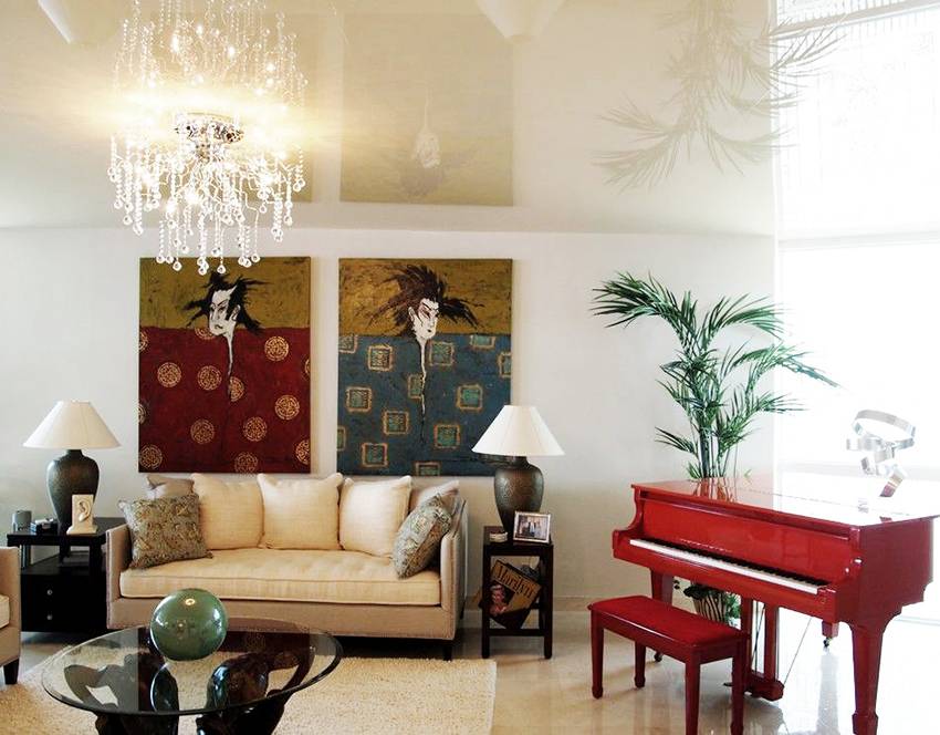 Если помещение оформлено ярко и броско, то лучше отдать предпочтение однотонному матовому покрытию