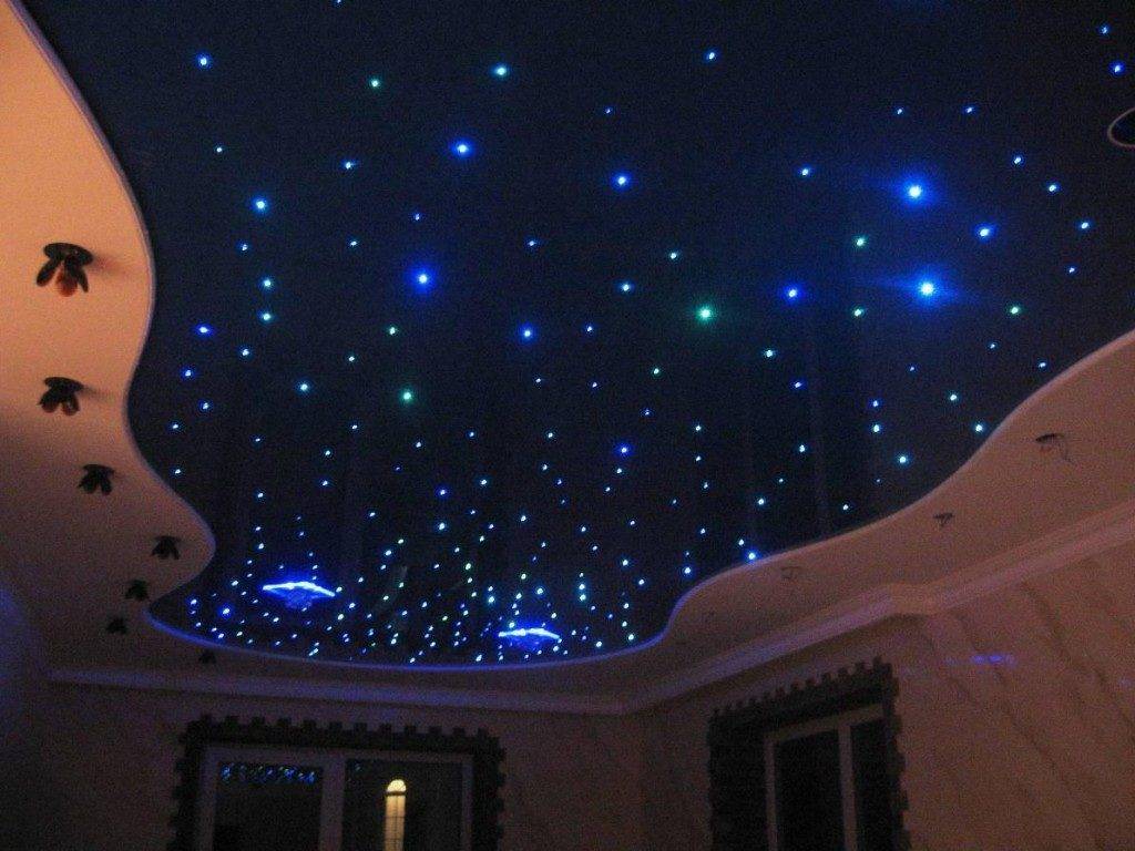 - за основу оформления потолочного пространства выберите идею с эффектом звездного неба. Актуален такой вариант для спальни или детской;