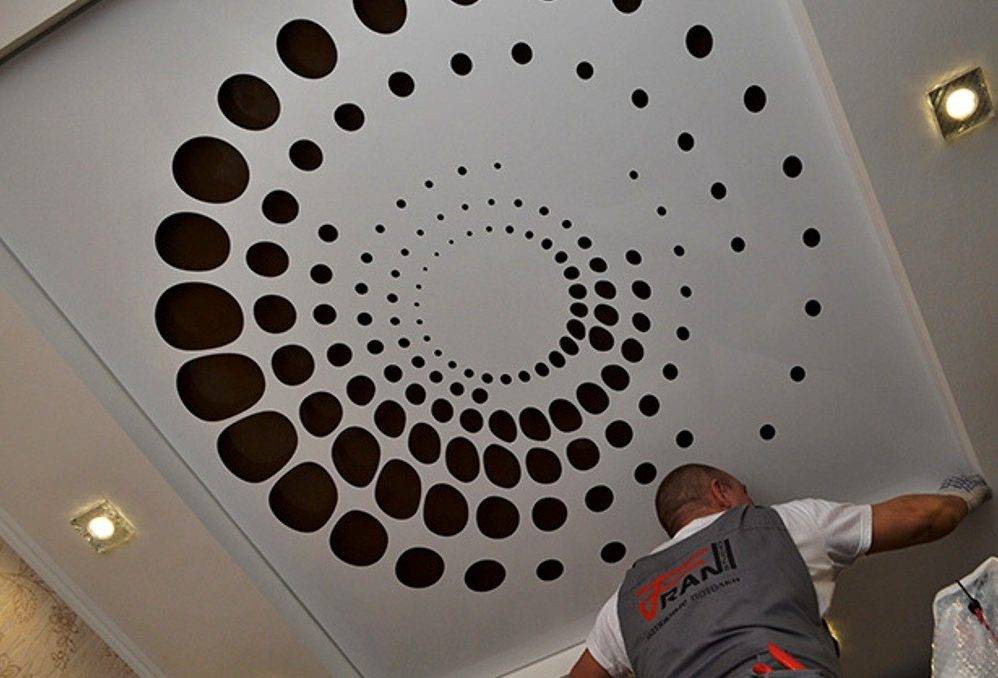 Этот вид резных полотен служит в большей степени для украшения. Оригинальная картинка или абстрактное изображение состоит здесь из более крупных отверстий. Эдакий своеобразный потолочный «трафарет». Перфорированное полотно монтируется ниже сплошной подложки, окрашенной по замыслу дизайнера в те или иные цвета. В совокупности оба слоя создают оригинальный и красивый трехмерный рисунок. Шаблонов изображений так много, что выбор бывает непрост. При желании и наличии средств возможно заказать индивидуальный проект. Правда, стоимость такого потолка будет значительно дороже, поэтому большинство предпочитает готовый дизайн.