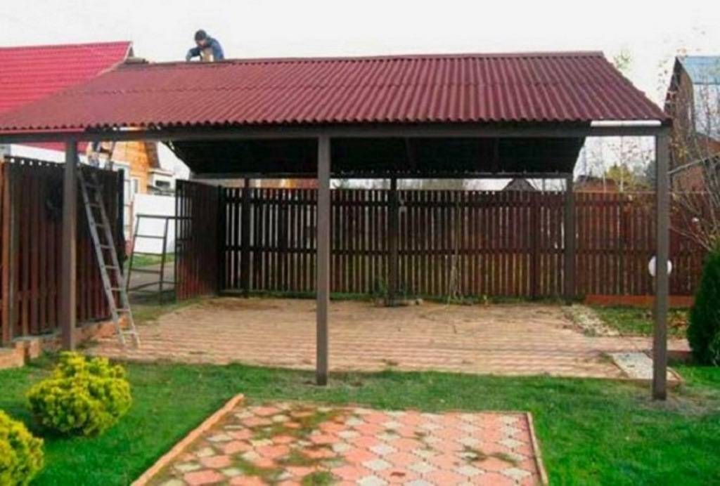 Навесы, примыкающие к дому, как правило, покрывают большую часть двора. Некоторые предпочитают закрывать всю придомовую территорию. Такой подход способствует универсальности применения сооружений: