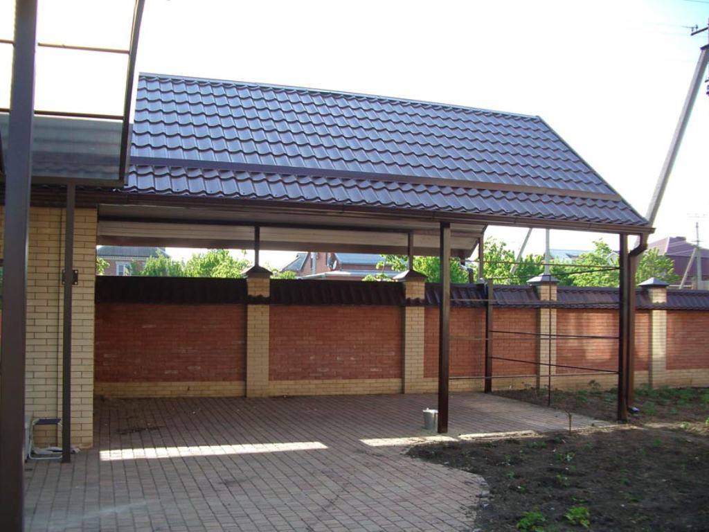 Совет: Для остекления металлического навеса рекомендуется использовать раздвижные алюминиевые системы, они не загораживают обзор, секции можно сдвинуть, чтобы максимально открыть постройку. Подобное остекление – надежная защита от осадков, пыли, порывов ветра, в небольшой мороз сохранит благоприятный микроклимат внутри, что сделает отдых комфортным в любое время года. alt=»Большой арочный навес из металла и кирпича» src=»https://roomgood.ru/wp-content/uploads/2015/10/с-кирпичом.jpg» class=»aligncenter» width=»550″ height=»413″ Большая металлическая конструкция, комбинированная с кирпичной кладкой