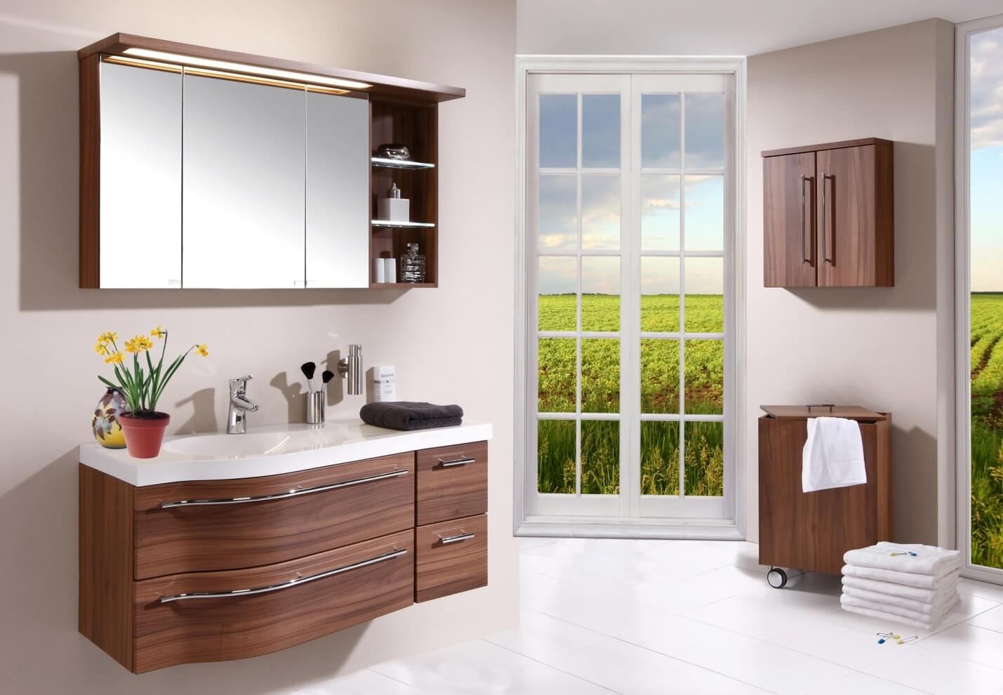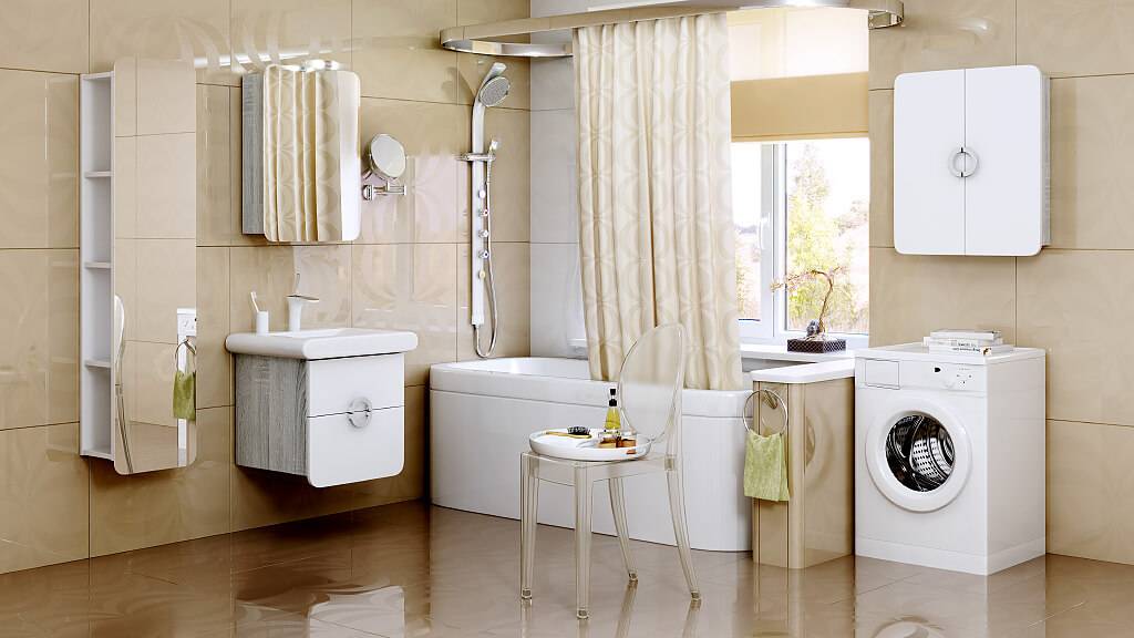 В стандартный набор мебели для ванной входят: умывальник-тумба, навесной шкаф (чаще всего с зеркалом), или заменяющий их «мойдодыр», шкаф-пенал. Если на шкаф места уже не хватило, то к вашим услугам полки и вешалки самых разнообразных конфигураций.