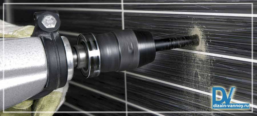 Вот теперь вооружаемся перфоратором или дрелью и сверлим отверстия в кафеле, а потом и в стене.