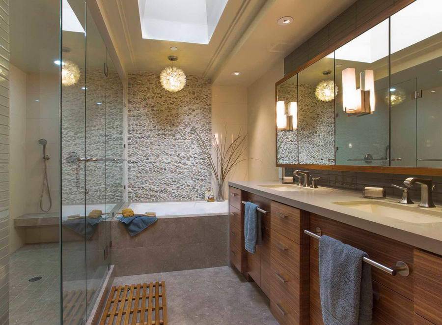 Менее важно, будет зеркало больше или меньше, важнее, чтобы оно было подвешено на оси симметрии раковины. Человеческий глаз любит симметрию, и подсознательно то, что симметрично, кажется нам гармоничным и красивым. Решаясь на отсутствие симметрии, очень важно найти оптический баланс интерьера, и эту задачу стоит поручить дизайнеру! Отсутствие симметрии и баланса испортит весь эффект